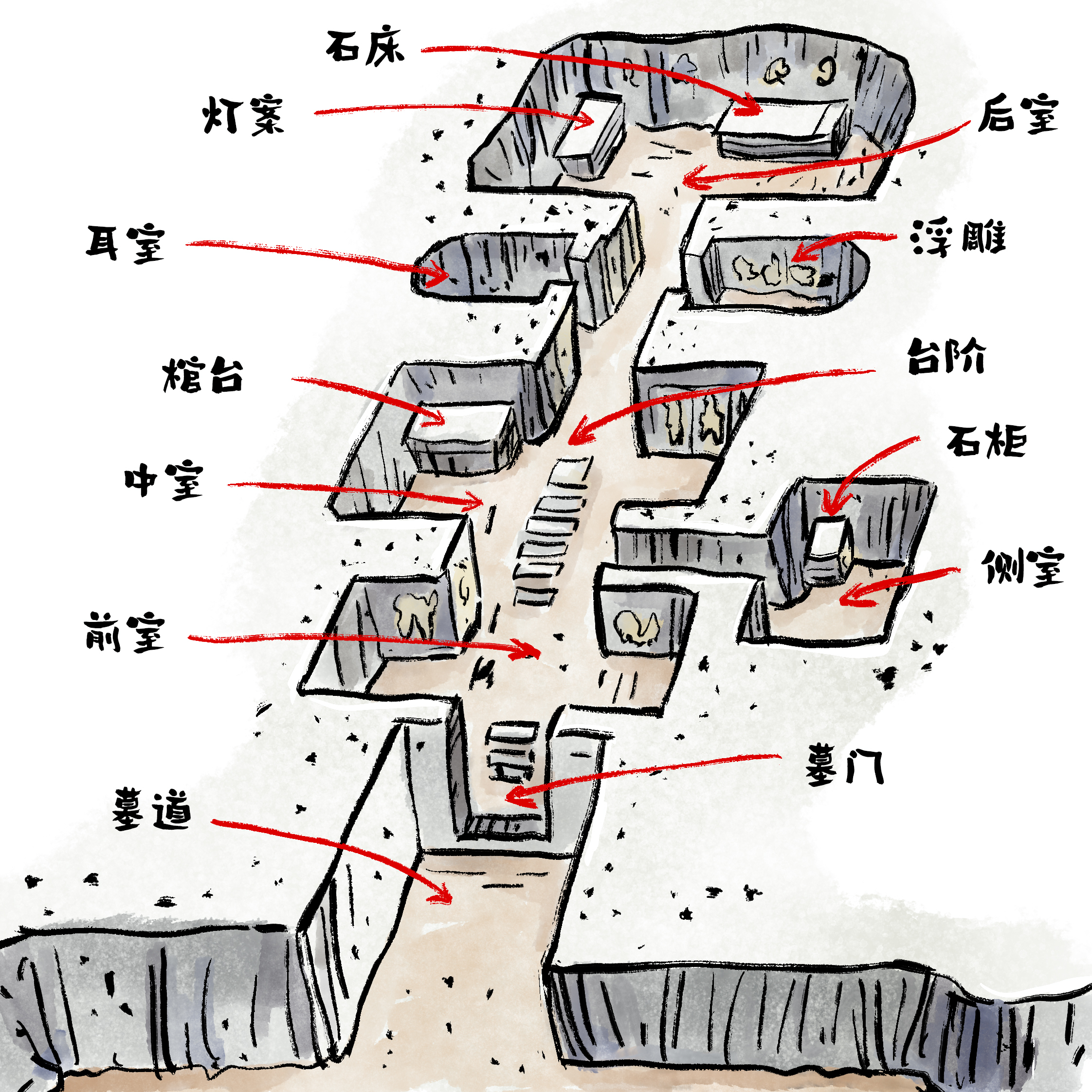 好多墓有圆雕、浮雕、线刻等建立装潢雕琢和画像装潢雕琢,还有一些墓内有红色涂料彩绘。画像装潢雕琢多在前、中室两壁和门壁上。