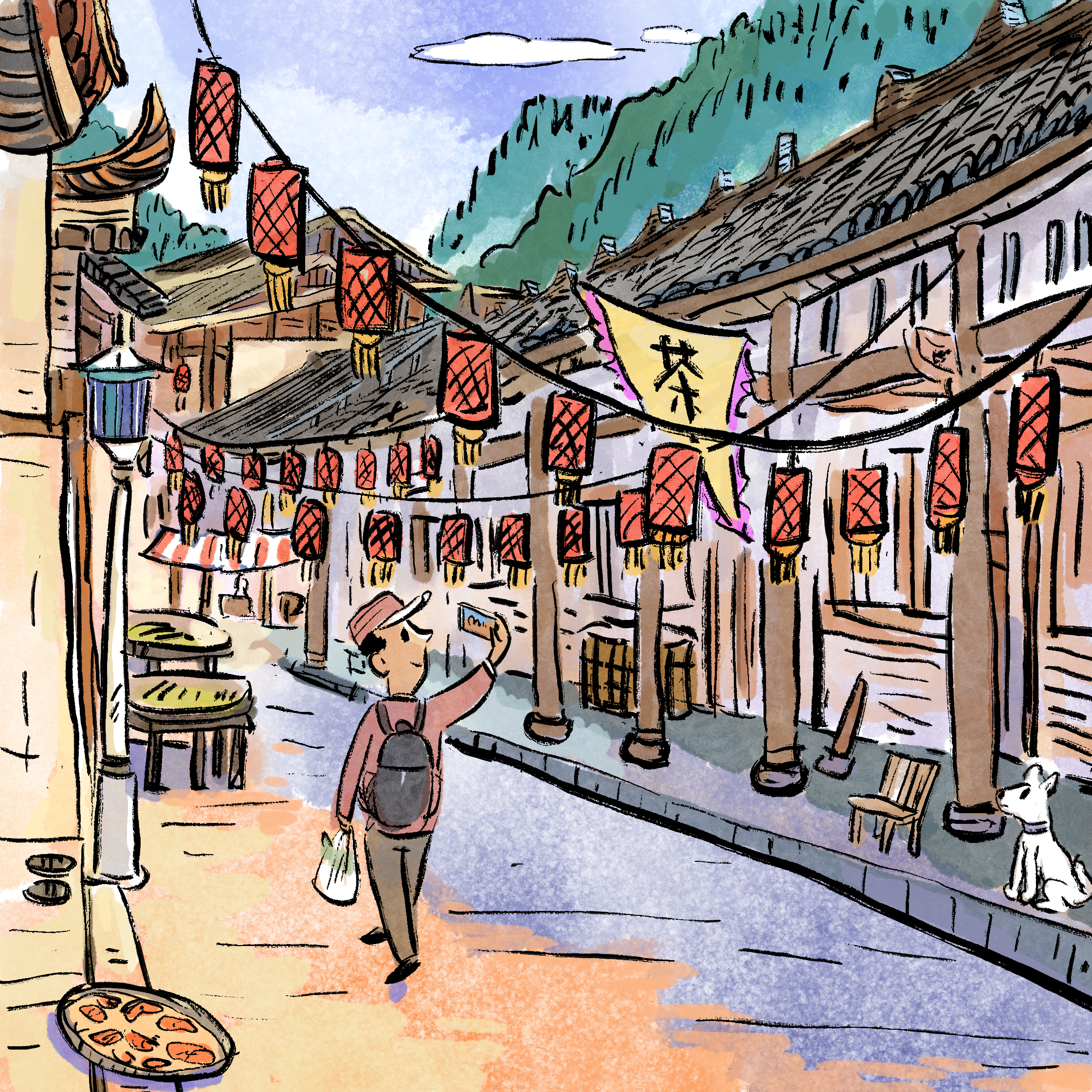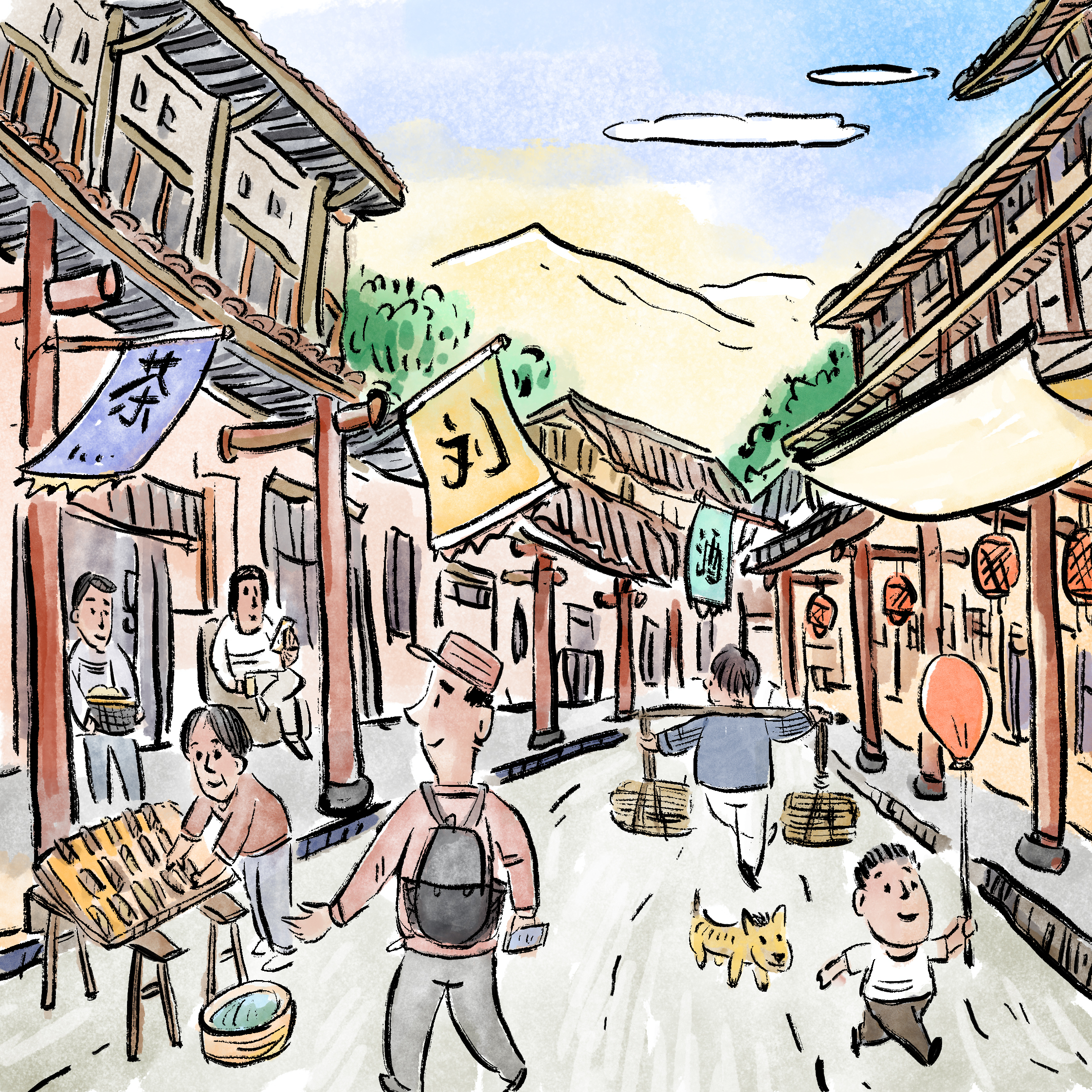 因为远隔城市的喧嚣,古镇遗迹保留得较为完好意思,街说念大多只好三四米宽,街说念双方的房屋都是木结构黛瓦平房,屋檐都向街心伸出,用木柱相沿,在门前变成一条遮阳避雨的走廊。走在街上,耳边时时常传来小商贩的叫卖声以及茶肆里的聊天声息,一片吵杂场景。