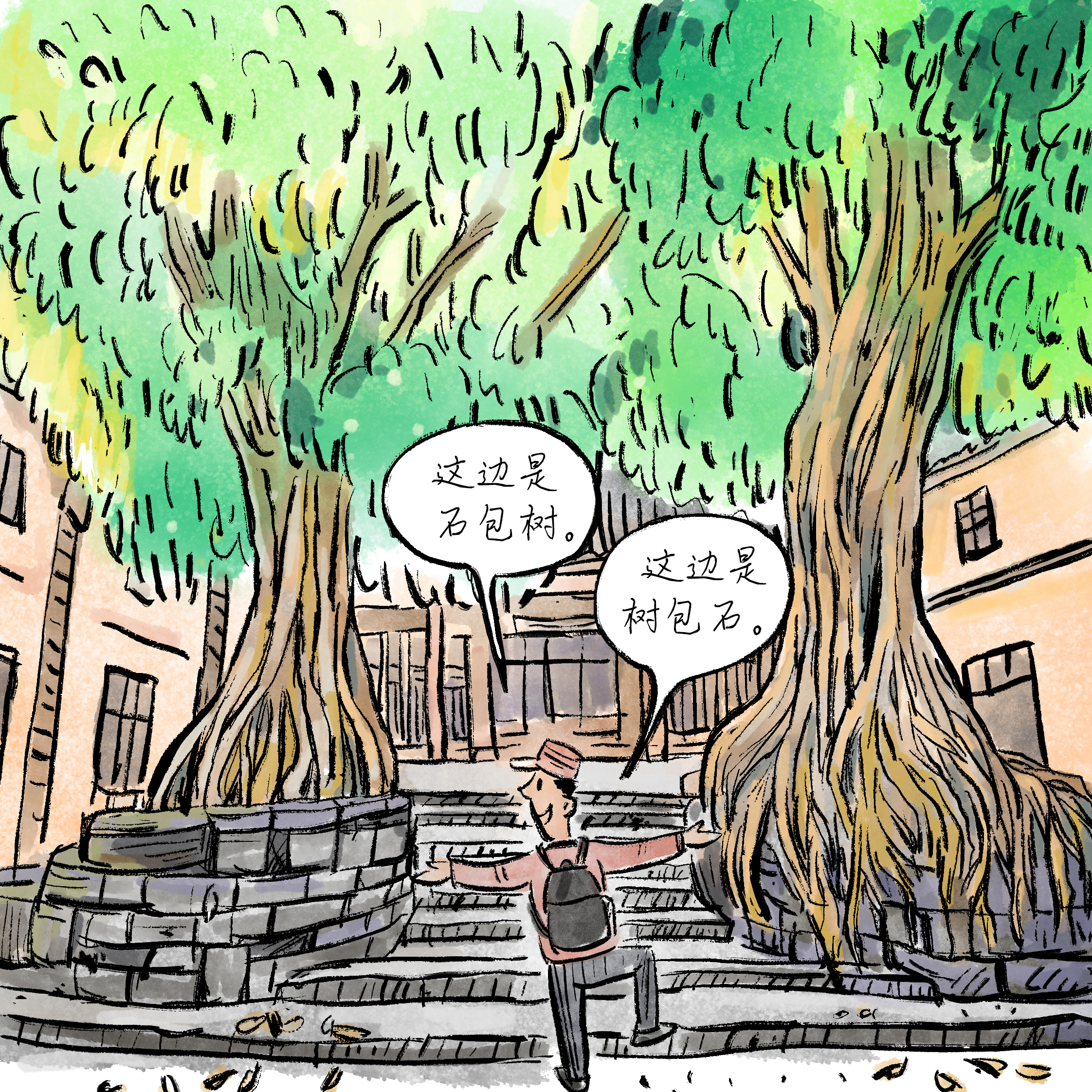 参预老街随地都可看见一株株老榕树,这是四川民居的一大特色。郪江古镇遍地都不错看到百年以上的老榕树,最有本性的就是地祖庙里的两棵,据说那两棵树是同期种下的,为了好意思不雅,种树的东说念主在两棵树的周围用石头砌了一圈矮墙,历程近百年的孕育,当前它们一棵是“树包石”一棵却是“石包树”,让游者看后不得不齰舌大当然造物之神奇。