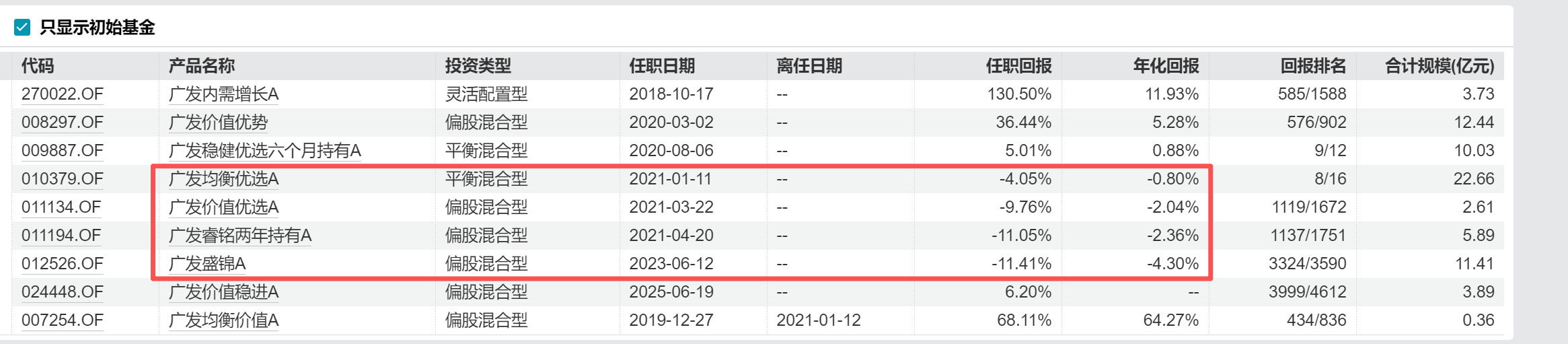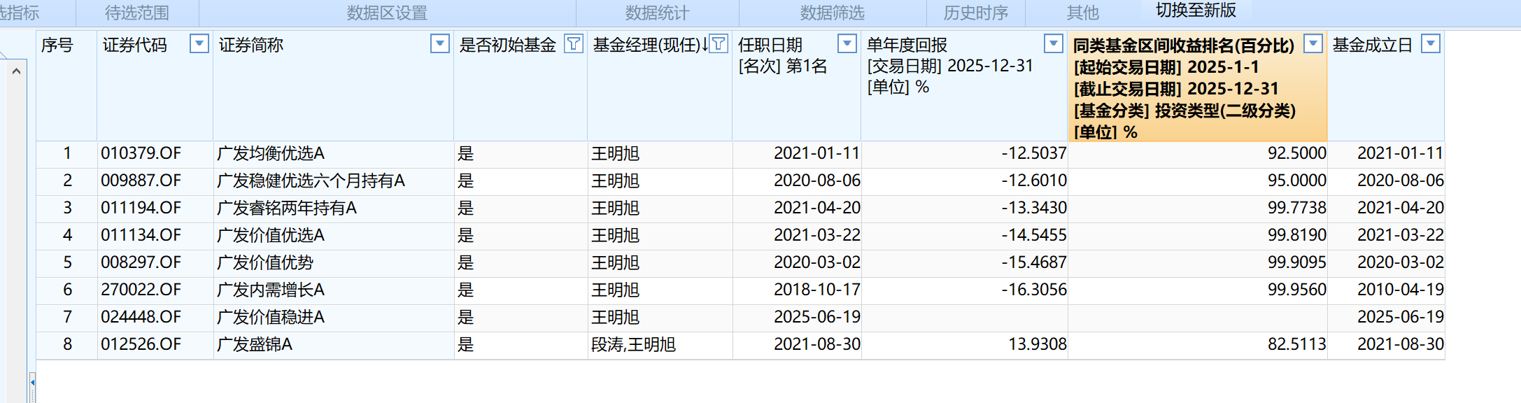 王明旭是广发基金旗下又一位知名度较高的基金司理,他也濒临着不小的功绩压力。他在管的8只基金中,有7只2025年归天10%以上,在同类基金中垫底。就中长久功绩来看,王明旭于2021岁首始科罚的广发平衡优选A、广发价值优选A、广发睿铭两年捏有A,以及2023年6月初始科罚的广发盛锦A,累计科罚答复均为负——尽管也曾阅历了2024年9月以来的牛市行情。